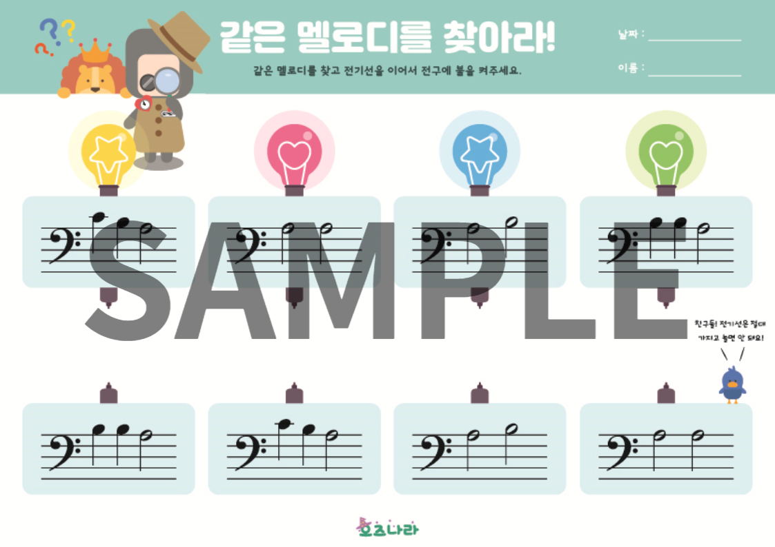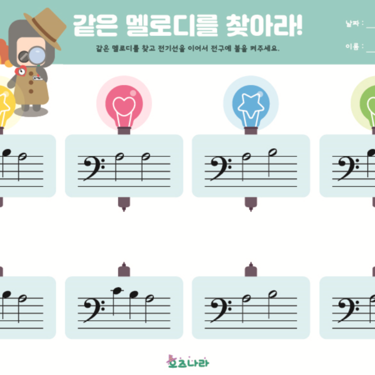 낮은음자리보표에 다양한 음들이 있어요. 쌍둥이처럼 똑같은 악보를 찾아 연결해 주세요.