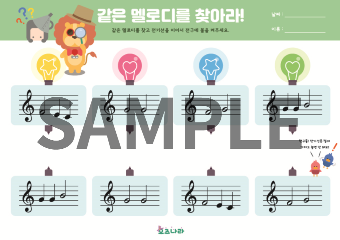 높은음자리보표에 다양한 음들이 있어요. 같은 악보를 찾아 줄로 연결해 주세요.