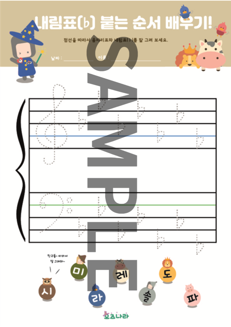 캐릭터들속에 음들이 보이시죠? 캐릭터들의 위치가 내림표붙이는 순서의 모양이에요.