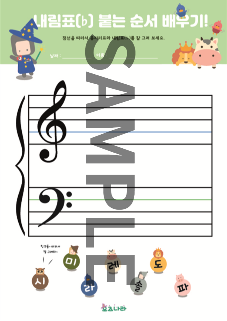 캐릭터 몸속에 적혀있는 음들과 캐릭터들의 위치를 잘 보고 빈 오선에 내림표를 그려보아요.