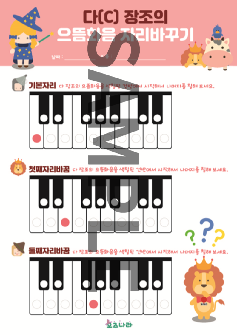 코드의 기본위치와 자리바꿈 자리를 찾아 해당음을 색칠하고, 소리도 들어보세요.
