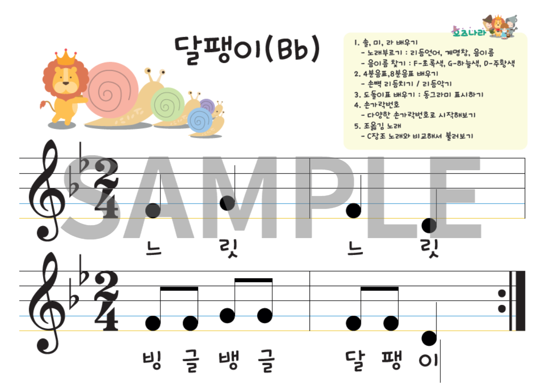 오선을 배우고 악보를 보기 시작한 아이들이 노래하면서 배우기 좋은 악보에요. 계명으로 솔-미-라음의 C장조의 곡을 Bb장조로 조 옮김하여 노래 부르고, 리듬치고, 건반에서 바뀐음자리에서 연주해 보면서 같은 노래 같은 느낌 이지만 다른 조를 연주하고 있는 걸 간접적으로 배울 수 있어요. 오른쪽 상단에 적혀있는 내용을 레슨때 아이와 함께 하면서 기초때 부터 리듬치기. 분석하기. 노래부르기 등 중요한 내용을 즐겁게 배울 수 있게 도와주세요.