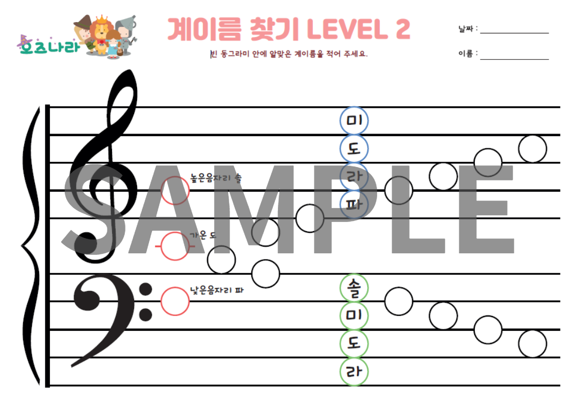 기준음을 배우면 악보를 읽는 독보(초견)에 도움이 돼요. 하지만 기준음만 알고 다음 음을 연결시킬 수 없으면 소용이 없지요. 레벨별로 오선에서  조금씩 더해지는 음들을 연결하면서 관계성을 배울 수 있는 이론지에요.