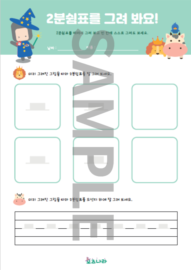 줄과 칸에 그려보면서 음표와쉼표를