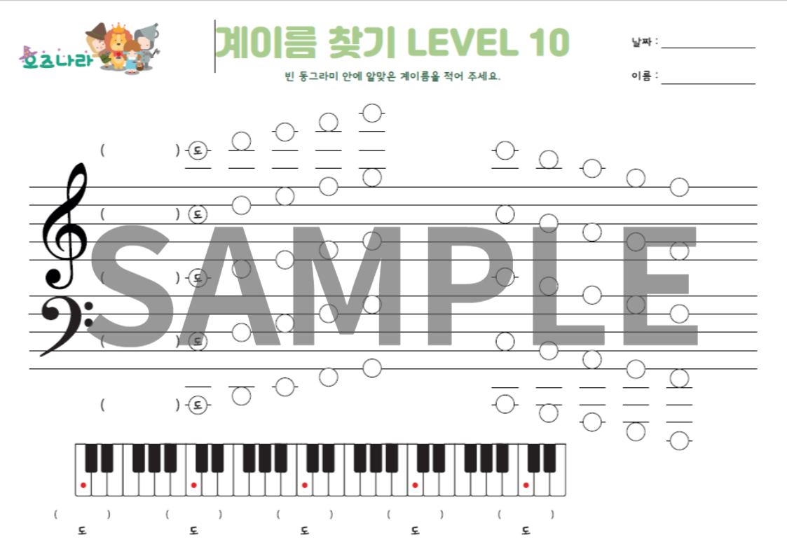 기준음을 배우면 악보를 읽는 독보(초견)에 도움이 돼요. 하지만 기준음만 알고 다음 음을 연결시킬 수 없으면 소용이 없지요. 레벨별로 오선에서  조금씩 더해지는 음들을 연결하면서 관계성을 배울 수 있는 이론지에요.