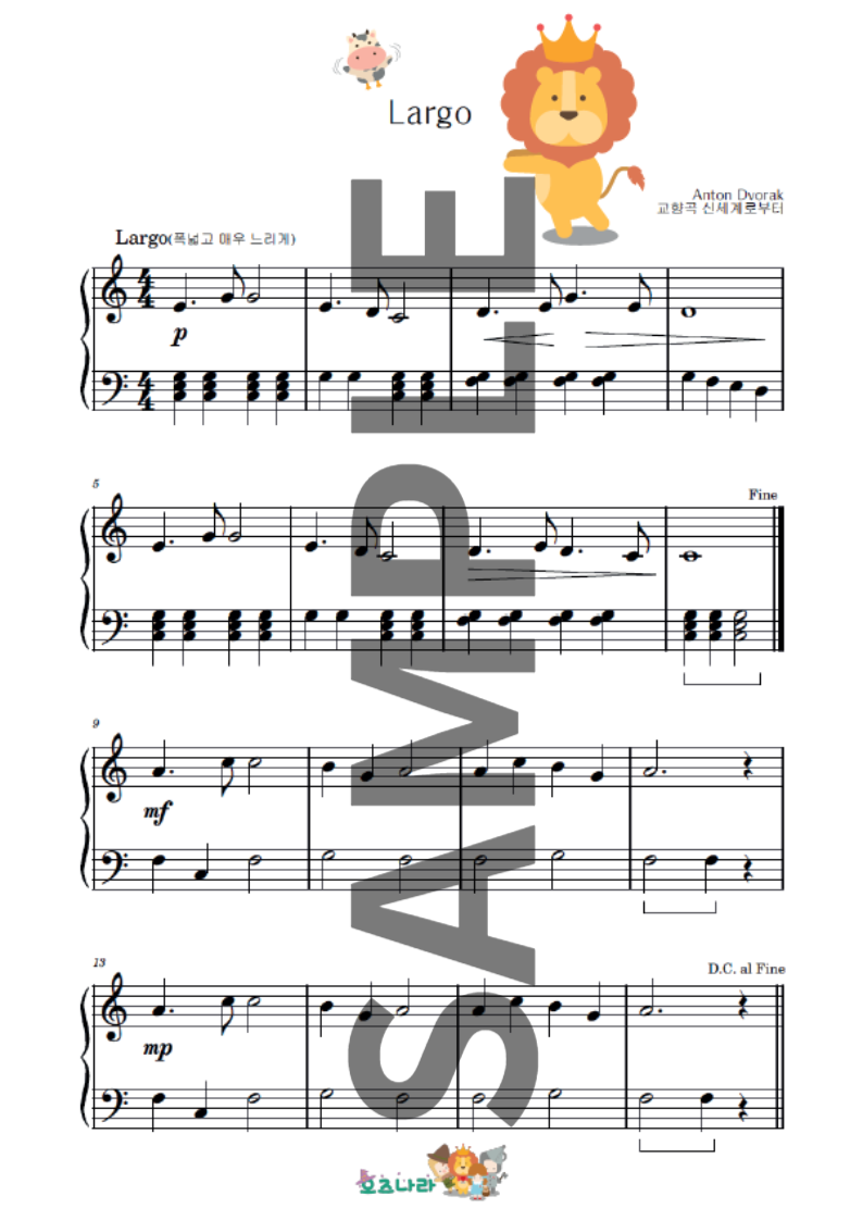 이 곡은 유명한 신세계로부터 교향곡 9번 2악장이에요. 여유를 가지고 연주하는건 아이들에게 생각보다 어려운 일이에요. 호흡과 음악에대한 이해, 감정표현이 같이 이뤄진다면 훨씬 근사한 연주를 할 수 있어요. 코드(화음), 반복기호, 붓점리듬에 대해 이론적으로 이해가 먼저 선행될 수 있게 도와주세요. 간단한 페달링을 연습할 수 있는 장점이 있는 곡이에요.~