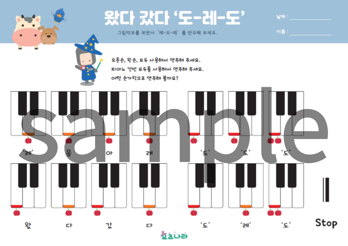 검은건반 2개 사이에 있는 '도-레' 음을 배우는 악보에요. 노래를 부르며 피아노 연주를 하다보면 저절로 음을 익힐 수 있어요. 건반에 사과음표를 넣어 편안하게 악보를 보며 연주할 수 있어요. 오른손, 왼손 그리고 88건반 모두 활용하면서 연주해 보세요. 자연스럽게 청음훈련도 된답니다~~매 월 진행되는 음악이론 번들 교육에 참여하세요. 레슨팁, 교구활용등에 관한 다양한 교육내용으로 알차게 꼼꼼하게 짚어드려요. 교육받으시면 오즈나라 이론과 악보들을 훨씬 더 잘 활용하실 수 있어요.